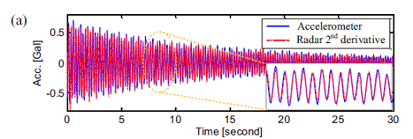 Since it can measure displacement directly, the radar sensor can also be used to obtain vibration information comparable to that obtained with an accelerometer, as shown in the figure below. This is an additional source of data that can be utilized to train the operational neural networks throughout the SHMSense network.