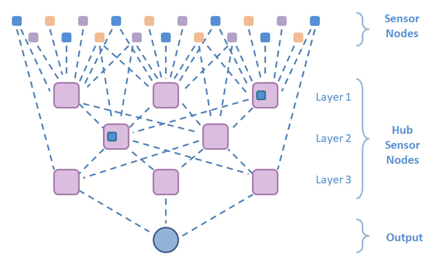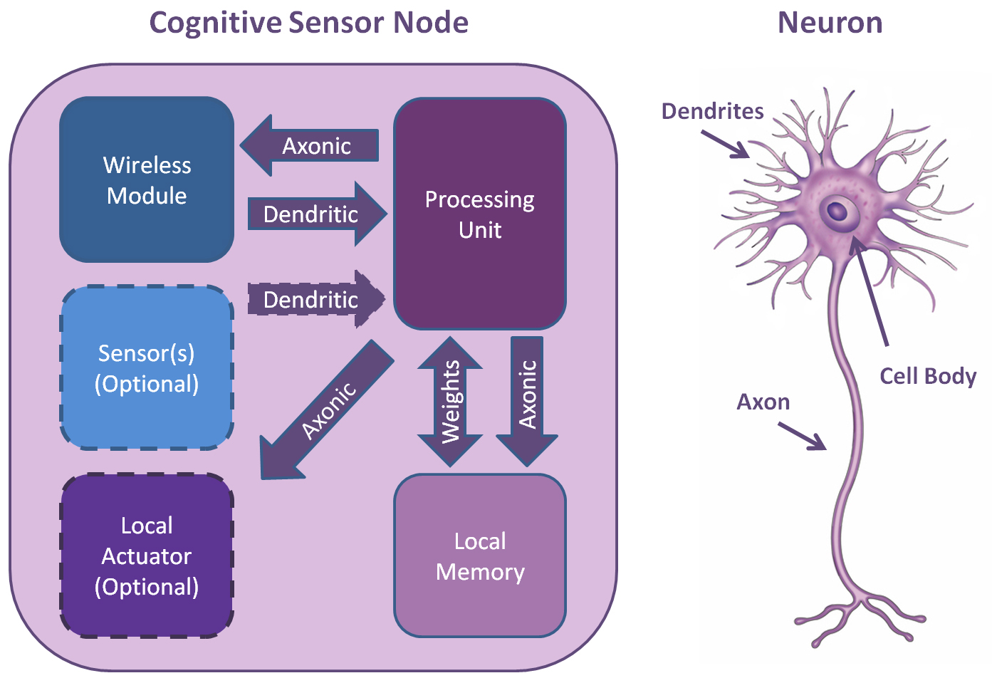 A single smart sensor node includes several components that also allow it to function as a hardware neural element. Input signals arrive as the outputs from other sensor nodes, and the internal processing unit generates a local output that may again serve as the input for other nodes. On board memory holds weights and biases of its connections and the results of any calculations. Multiple sensors can optionally be included within the node, and nodes may also house a local actuator for initiating external functions. The processing unit performs internal calculations, which may be the radar displacement algorithm, the identity function, or a full deep learning network model response with numerous hidden layers with multiple hidden units per layer. The figure below shows the proposed neuronal structure of the smart sensor node.