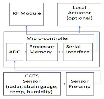 The SHMSense sensor node hardware module is re-configurable by plugging in any sensor type (e.g. radar, strain gauge, temp, humidity, etc.) and is signal conditioned with a pre-amplifier/filter before being digitized by the integrated Analog-to-Digital Converter (ADC) in a micro-controller module. Signal processing and actuation control software is programmed into the micro-controller and data is routed to the RF module for data transmission to the rest of the intelligent network. If desired, a local actuator is also controlled by the micro-controller module over the serial interface. The block diagram is shown in the figure below.