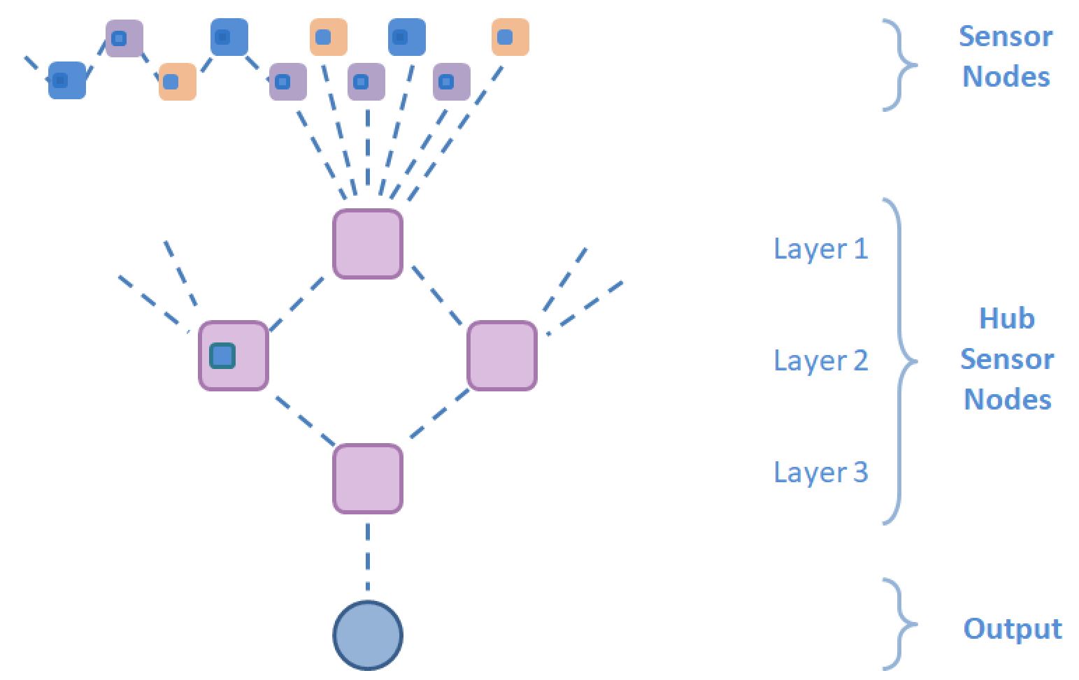 In SHMSense, the sensors themselves are distributed throughout the structure in wireless sensor nodes. Intermediary sensor nodes are called hub nodes. Although actually sharing the same hardware platform, sensor nodes typically reside at the edges of the network, whereas hub nodes are expected to connect to more than one sensor node. Sensor nodes may also be daisy-chained, such as along a tunnel or wing. They may also connect to more than one hub, and the hubs themselves may connect to other hubs in a mesh network topology.